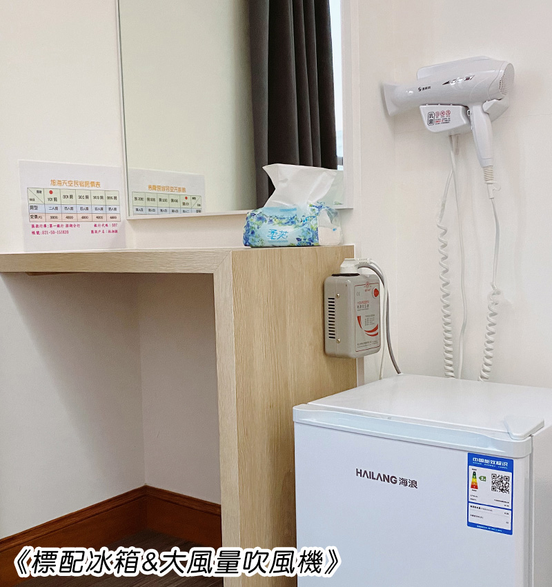 房間設施配有:獨自觀景陽台(附桌椅)、50吋液晶電視、冰箱、吹風機、牆上掛勾附衣架、感應卡式門鎖、空調冷暖氣、WIFI無線上網、免費瓶裝水、乾濕分離衛浴設備(依政府規定不提供拋棄式盥洗用品~敬請自備)